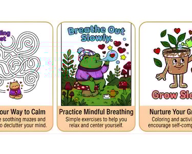 Every page is designed for anxiety relief, self-care, and emotional wellness—in a playful, toddler-level format that makes slowing down feel comforting and fun. And to make coloring easier, each page is printed single-sided with a blank back to help prevent bleed-through and keep your artwork looking its best.