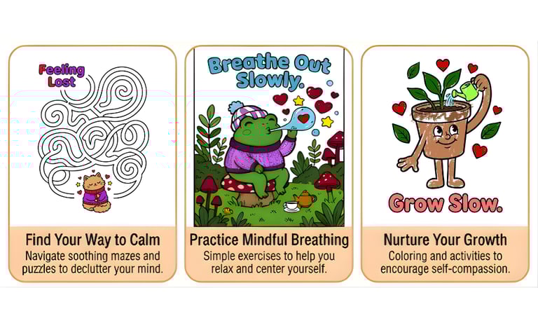 Need a soft moment for your tired grown-up brain? Love Yourself Softly gives you the cutest break ever with super-easy coloring pages, calming mazes, gentle matching games, cozy patterns, and simple word searches made just for adults who want stress relief without thinking too hard.